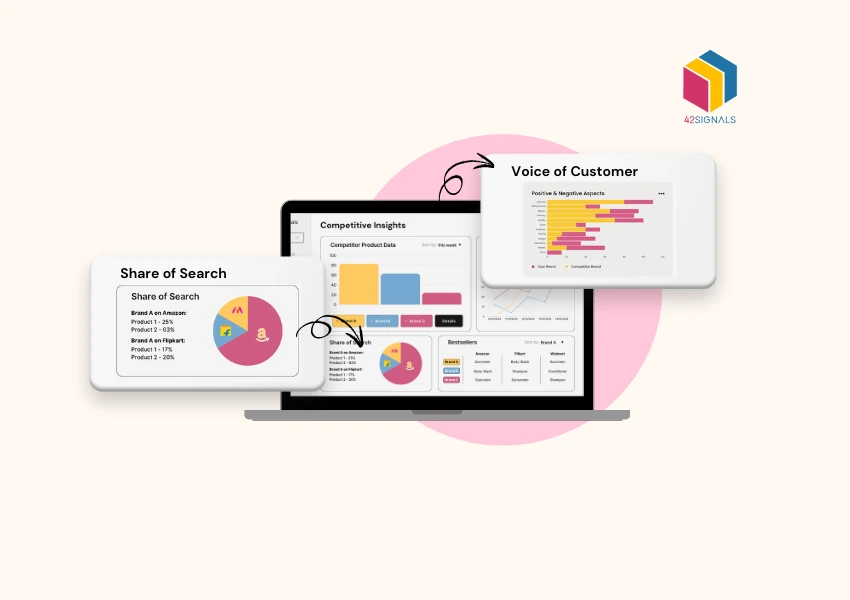 - Cross-Platform Integration: How do your products perform on Amazon? What are competitors doing on their websites? Such insights are easily available through a tool like 42Signals.